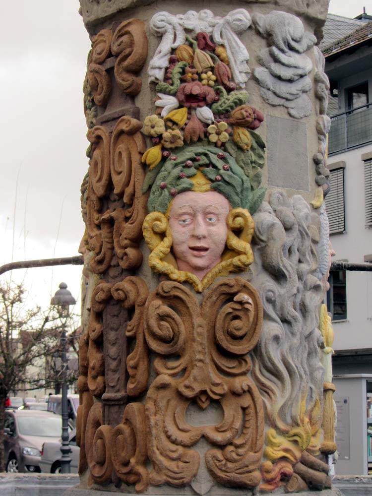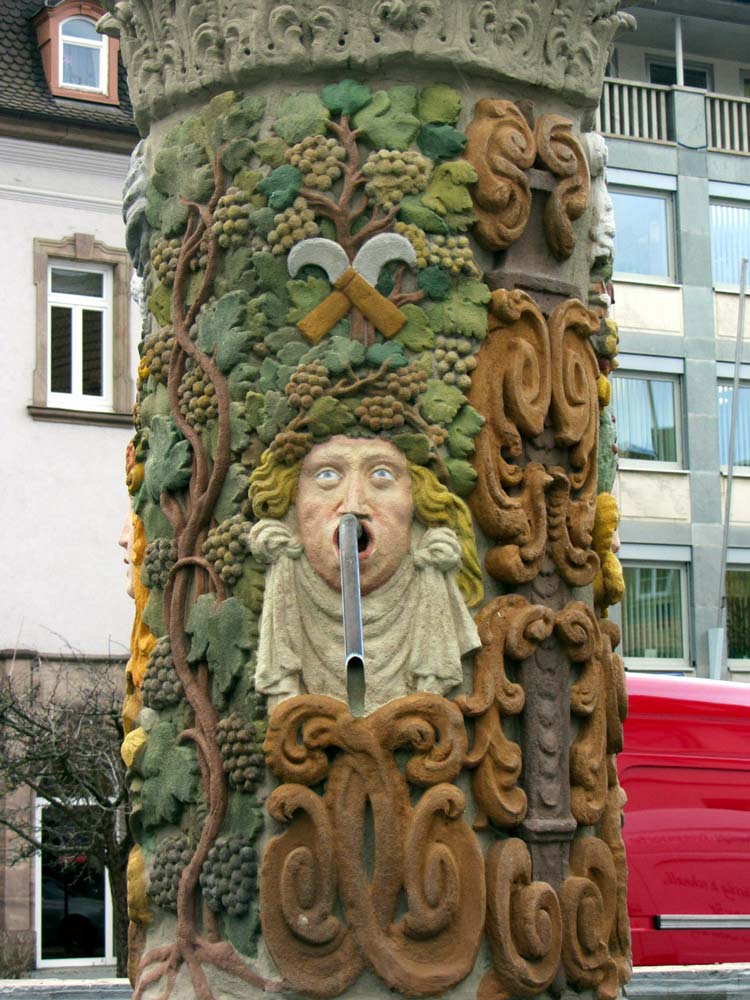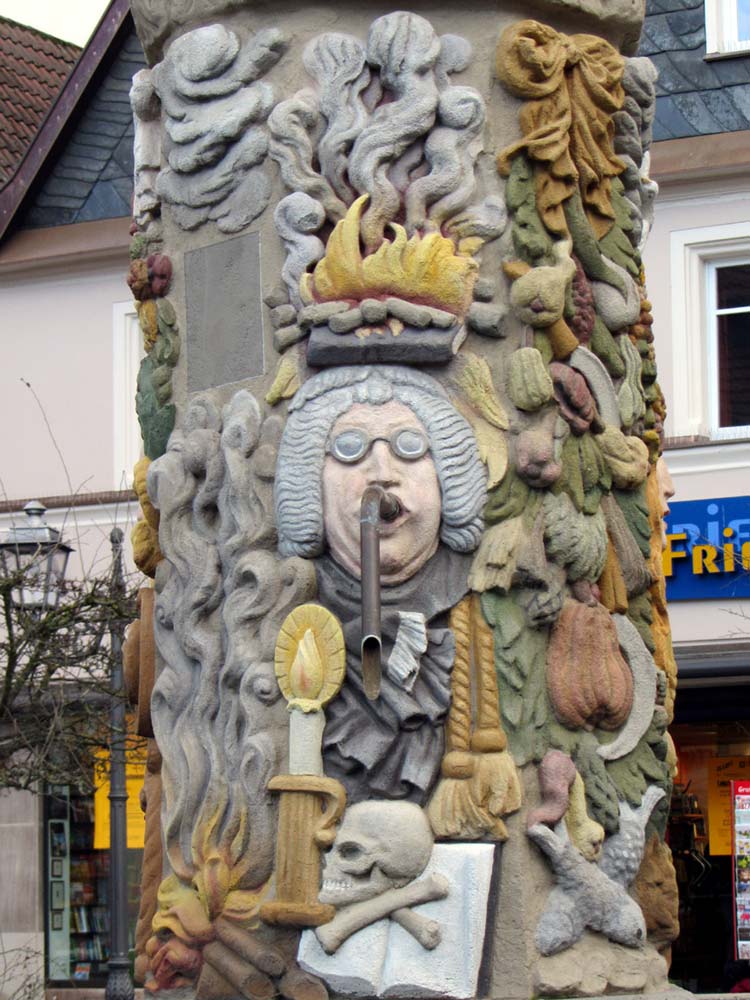 Das greise Gesicht mit der Perücke auf dem Kopf soll offensichtlich einen Gelehrten darstellen Die Brille bedeutet Weisheit. Wir haben uns viel Wissen angelesen. Die aufgeschlagene Bibel, auf der uns aber schon der Totenschädel das nahende Ende aufzeigt, unterstützt dies. Noch gelingt es der Kerze, die Mächte der Finsternis zu vertreiben, aber über dem Haupt lodert schon das Feuer, das alle menschliche Gelehrsamkeit in ein Nichts verwandeln wird. 2002 und 2015 wurde der sehr symbolträchtige Brunnen fachgerecht saniert und die in der Barockzeit übliche, kräftige Farbgebung wieder hergestellt.