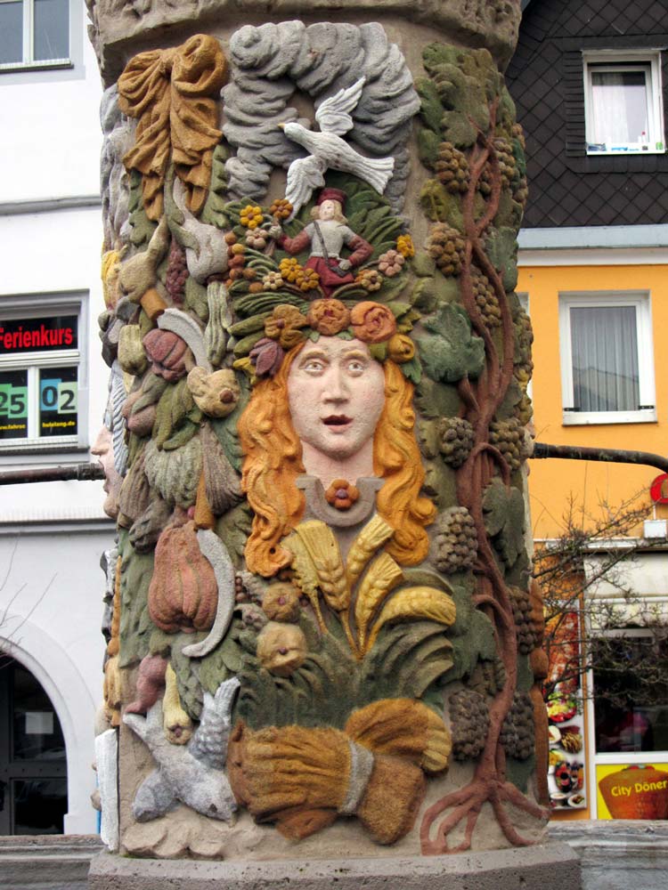 Es lohnt sich, die Brunnensäule einmal näher anzusehen. Selbst so mancher Kulmbacher hat noch nicht bemerkt, dass sie verziert ist mit Allegorien der vier Jahreszeiten. Jeder Jahreszeit ist ein Gesicht zugeordnet. So wie das Jahr vergeht, altern auch die Gesichter. Dem Frühling hat Schlehendorn die römische Göttin Flora mit einem beinahe kindlichen Antlitz gewidmet. Ihr gegenüberliegend finden wir den Sommer mit üppigem Blütenreichtum und der griechischen Göttin der Fruchtbarkeit, Demeter. Den Herbst mit den stattlichen Weinranken vertritt der römische Gott des Weines, Bacchus. Gegenüberliegend finden wir den Winter, das Ende des Jahres, womit aber auch das Ende unseres Lebens naht.