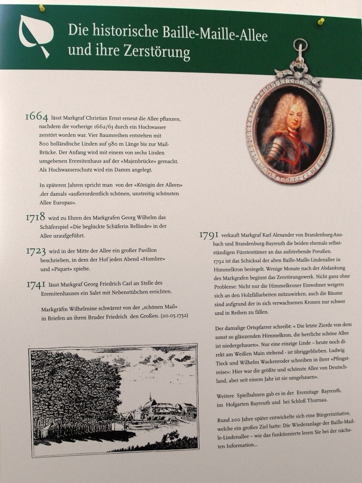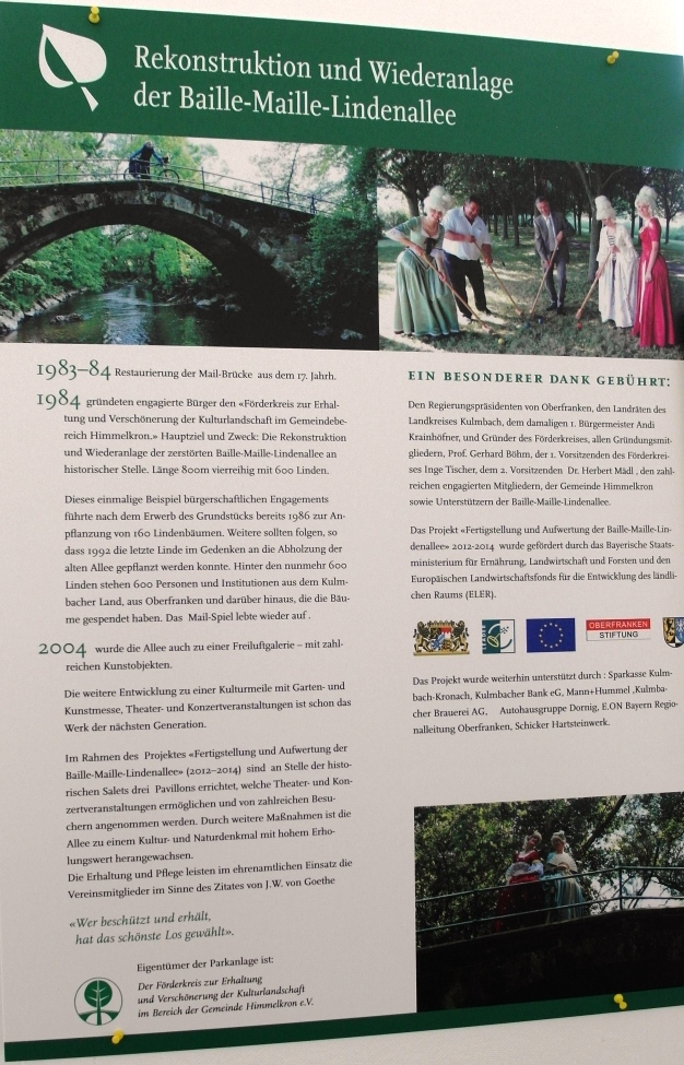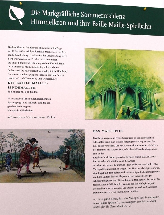 Der Bayreuther Markgraf Christian Ernst (1644/1661–1712) begegnete diesem Spiel der Aristokraten vermutlich auf seiner Kavalierstour durch Frankreich. Kurz darauf entstanden in der Residenzstadt Bayreuth im Hofgarten, der Eremitage und sogar an seiner Sommerresidenz in Himmelkron Baille-Maille-Spielanlagen. Letztere ist für 1662 als Erstanlage verbürgt. Nach französischem Vorbild bestand diese Anlage aus einer vierfachen Baumreihe –