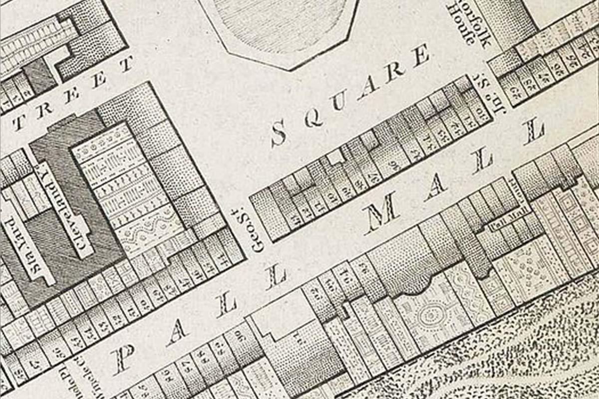 - Stadtplan-Auszug mit der Pall Mall in London von 1799
