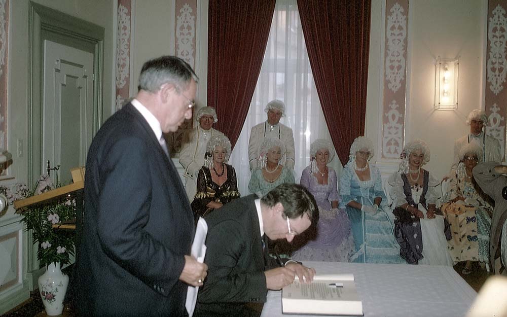 Die Gemeinde Himmelkron nutzte den restaurierten Saal ab und zu für Trauungen oder – wie hier auf dem Foto – wenn z. B. ein prominenter Ehrengast aus der Hohenzollern-Linie sich im Goldenen Buch der Gemeinde eintragen durfte. Auf dem Foto ist es Prinz Christian Sigismund von Preußen. Umrahmt wurde der Festakt von Mitgliedern der Rokokogruppe Kulmbach. Der Saal ist inzwischen für die Öffentlichkeit wieder geschlossen.