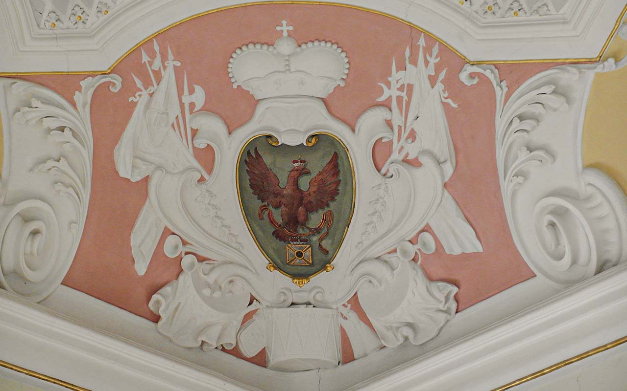 Der Decken- und Wandstuck stammt von dem italienischen Stuckateur Andrea Domenico Cadenazzi. Der Rote-Adler-Orden in der Stuck-Kartusche und die Initialen von Markgraf Georg Wilhelm zu Brandenburg fallen besonders auf.